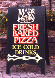 Traditional signwriting and gold leaf on an A frame timber sign.